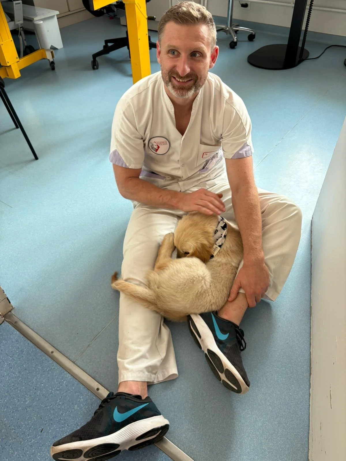 Tatou est bien plus qu’un chiot. Il est un cœur à quatre pattes, une présence douce, une aide précieuse. Déjà à l’œuvre au service Rééducation du CHPG avec l’ergothérapeute, il apporte soutien, sourire et motivation. Chaque jour, il nous rappelle pourquoi nous sommes si fiers de lui.