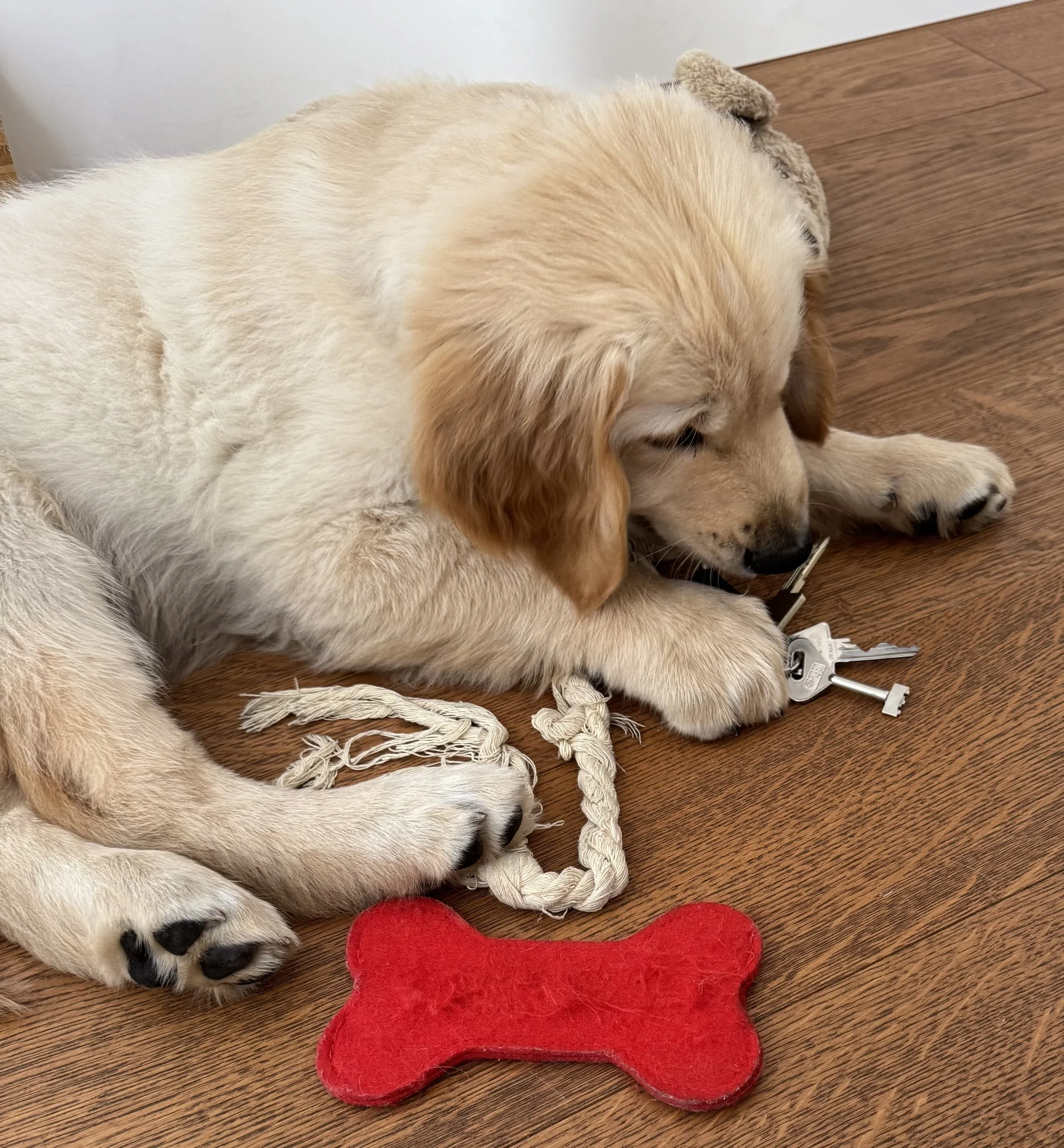 J’ai reçu de nouveaux jouets ! Quel bonheur de découvrir toutes ces formes, ces textures… et surtout, une trousse de clés rien que pour moi. Pas pour ouvrir des portes, non… mais pour m’habituer à la sensation du métal dans ma bouche. C’est bizarre au début, mais je comprends que ça fait partie de mon apprentissage. Et puis, c’est amusant ! Un pas de plus vers mon futur métier… avec une clé dans la bouche et un sourire dans les yeux. 🐾🗝️